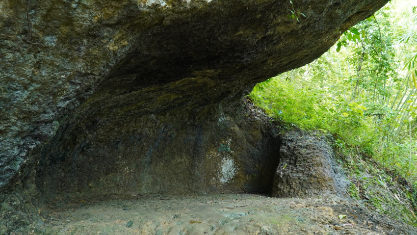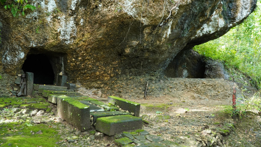 Di bagian depan pintu masuk gua pertama terdapat susunan batu andesit sejumlah 17 buah. Batu-batu tersebut berfungsi sebagai landasan jalan menuju ke gua, alas pintu masuk, dan penanda sisi jalan, beberapa diantaranya dipasang dengan posisi berdiri.